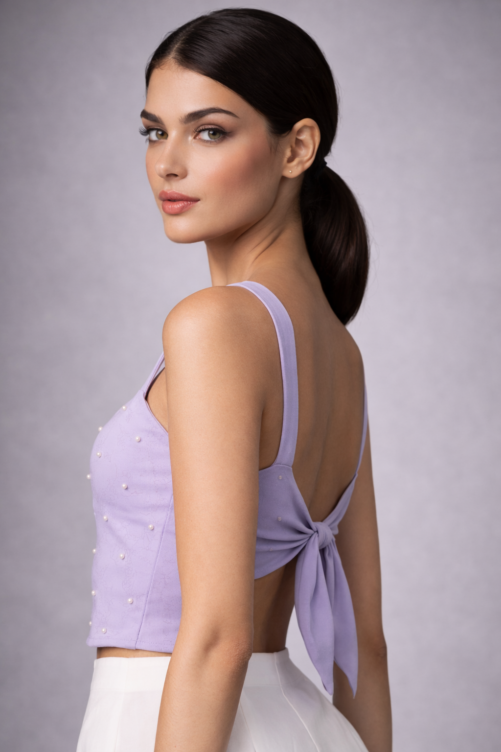 Details: Sweetheart Neck | Pearl Embellished | Sleeveless | Bow Back
