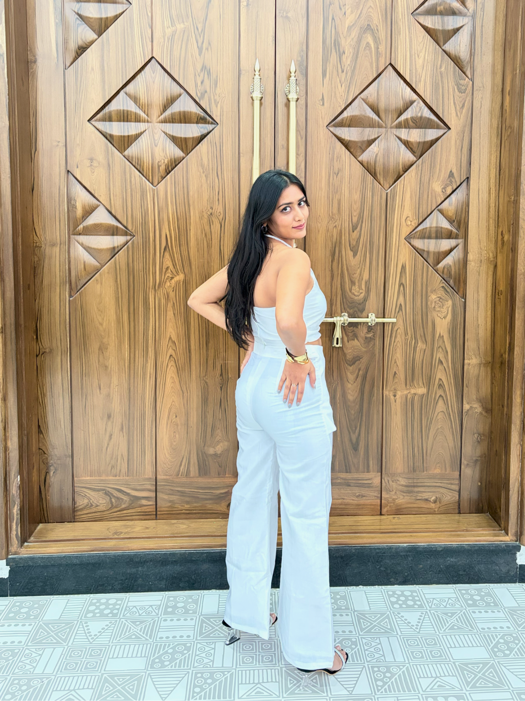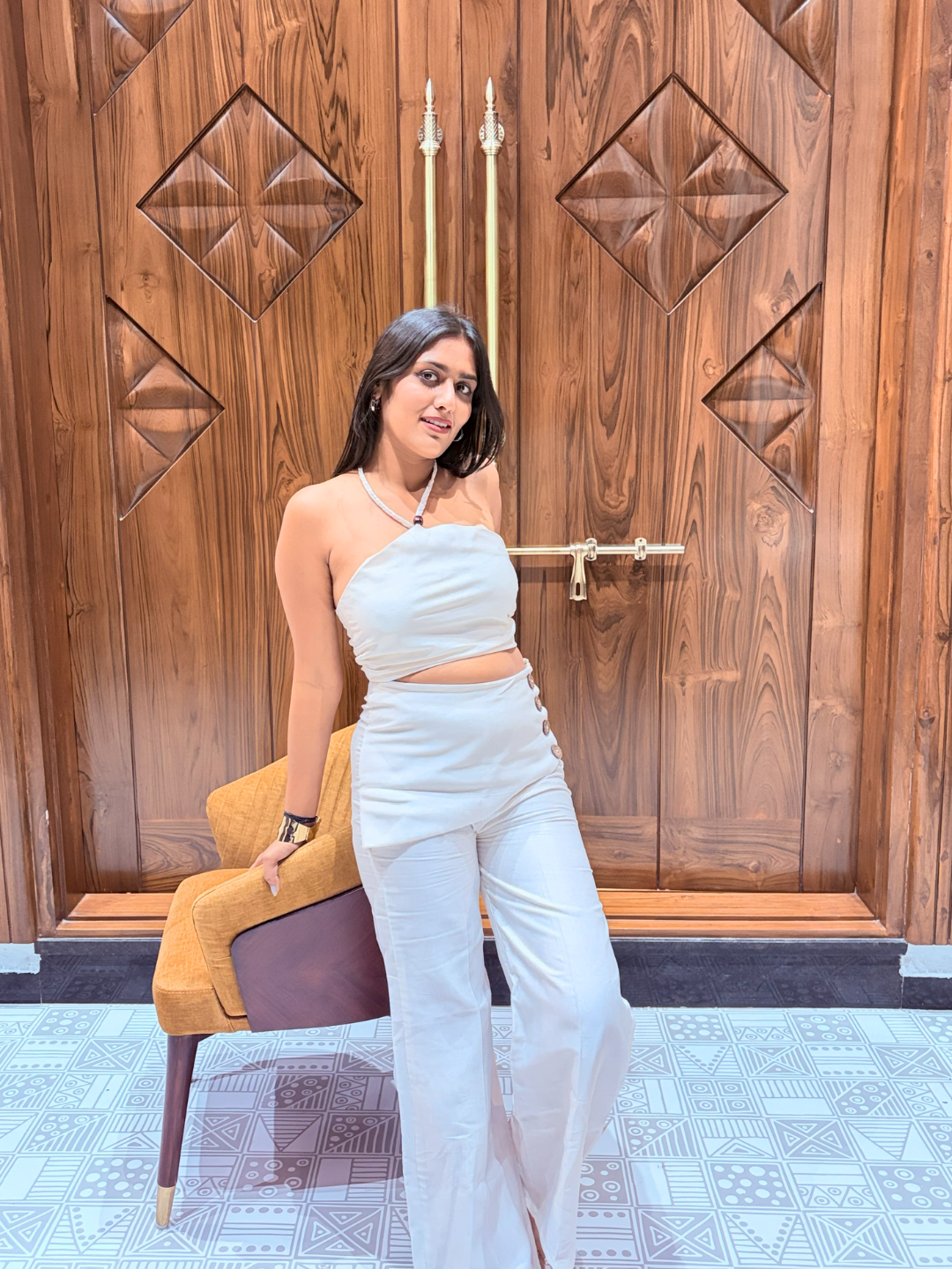 The braided knot detail acts as built-in jewellery, the asymmetrical flap secured by oversized wooden buttons adds a layer of mystery, leading the eye exactly where you want it while the backless cut keeps them guessing as you walk away.