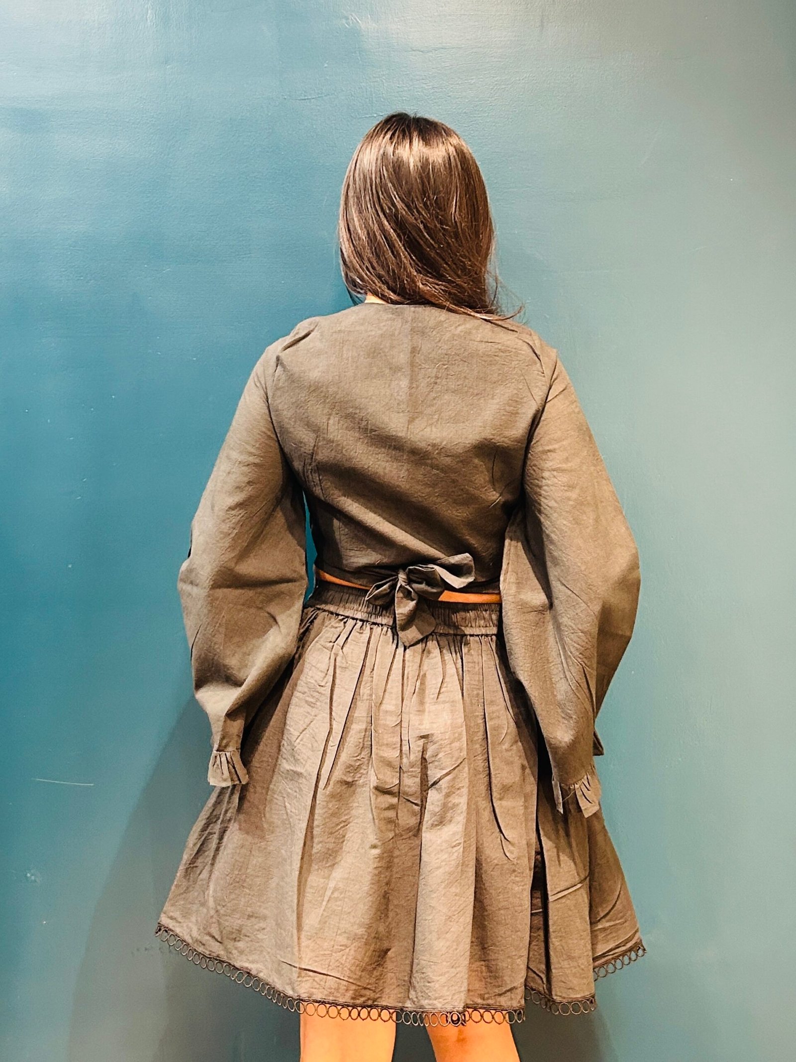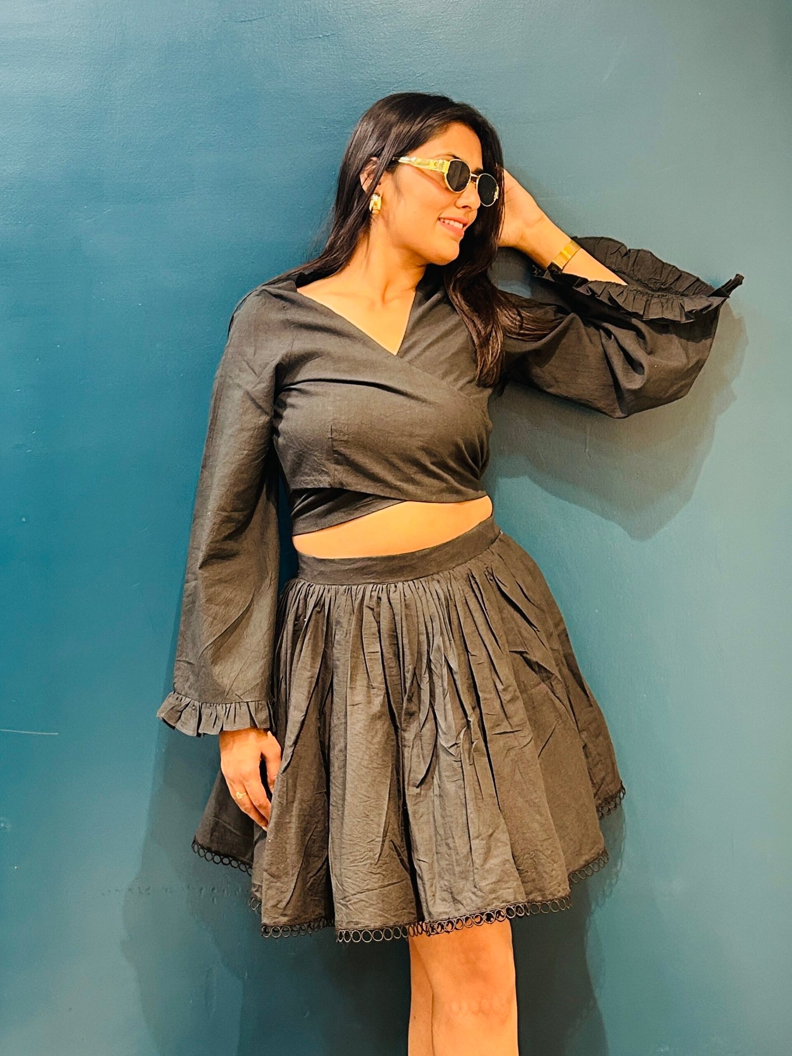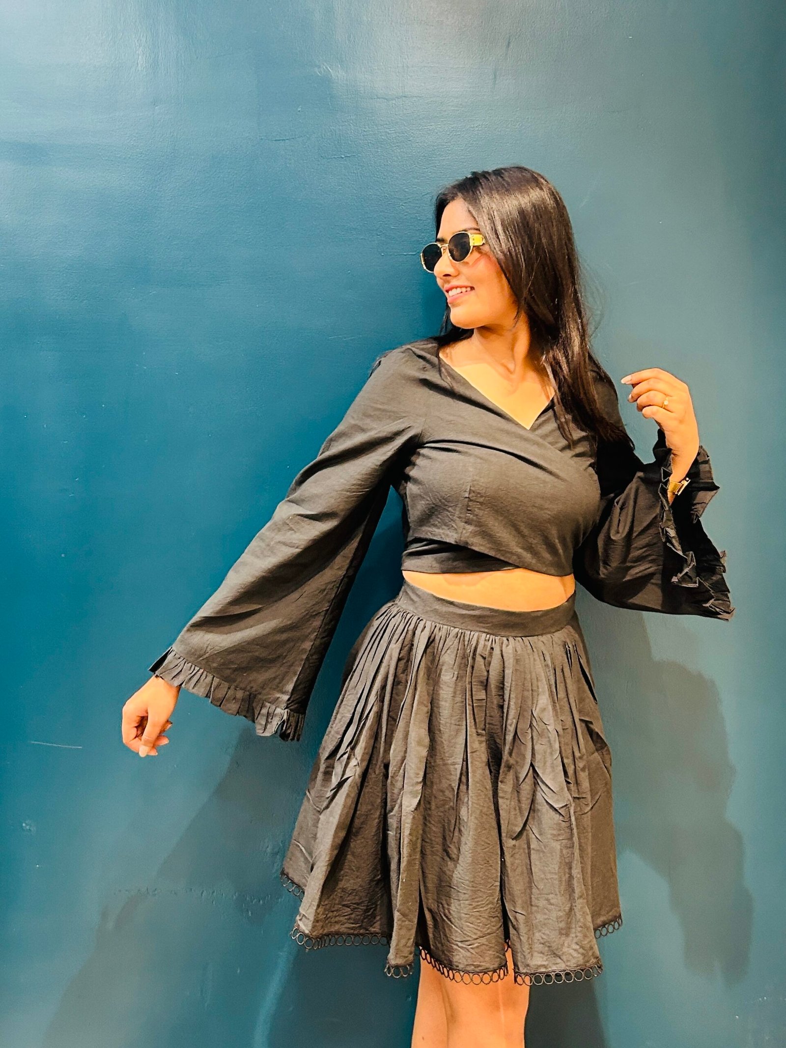Top: Wrap around bust with bow tie-up at back | Full Sleeves with Frill Cuffs