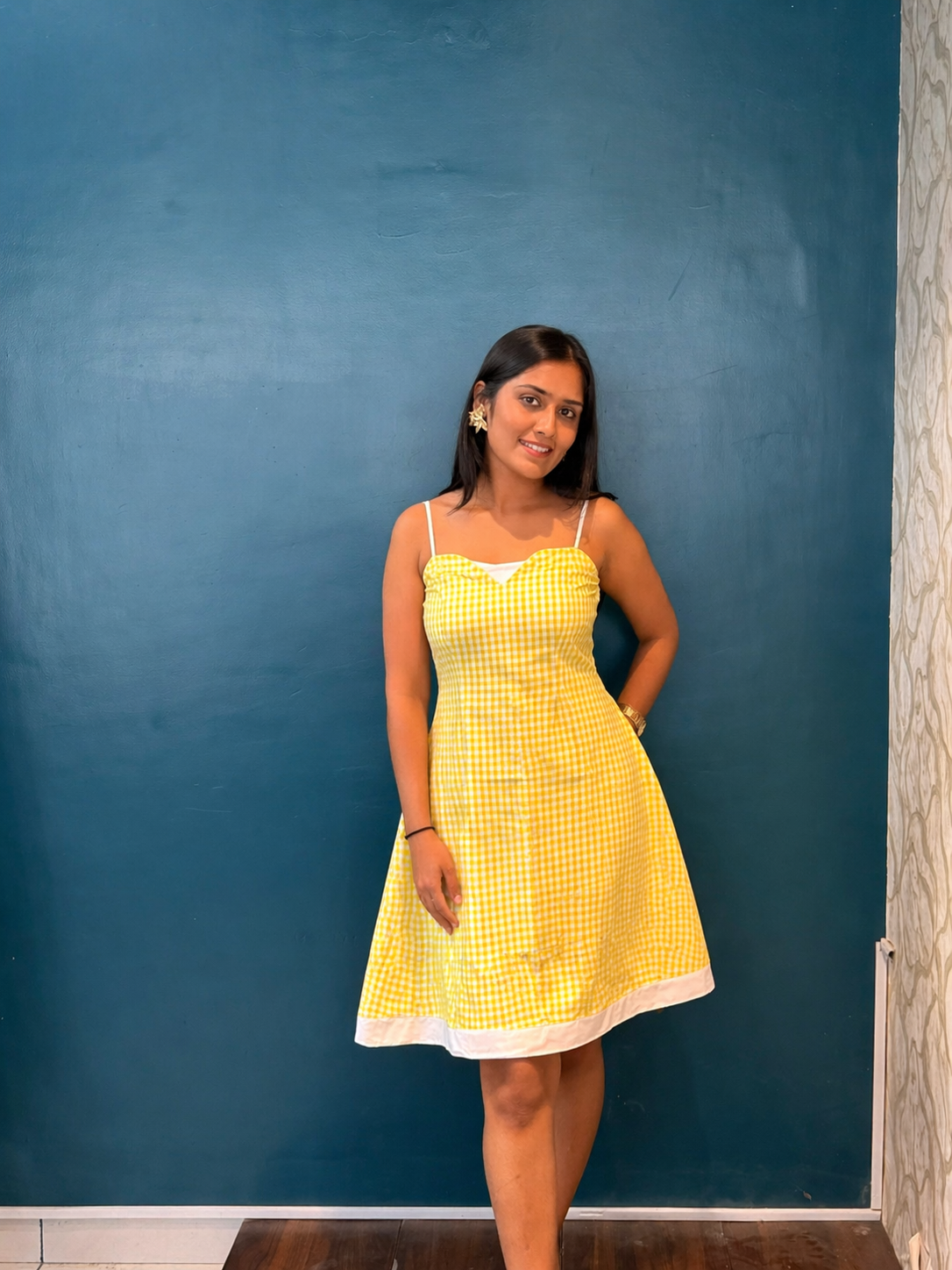 Details: Sweetheart Neckline | Sleeveless | Bow tie-ups on shoulder | Gingham Print | Flared Fit