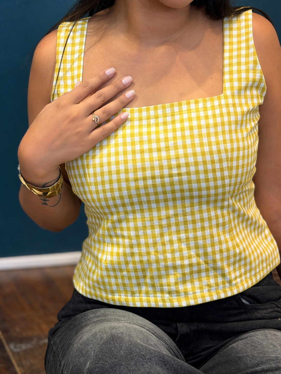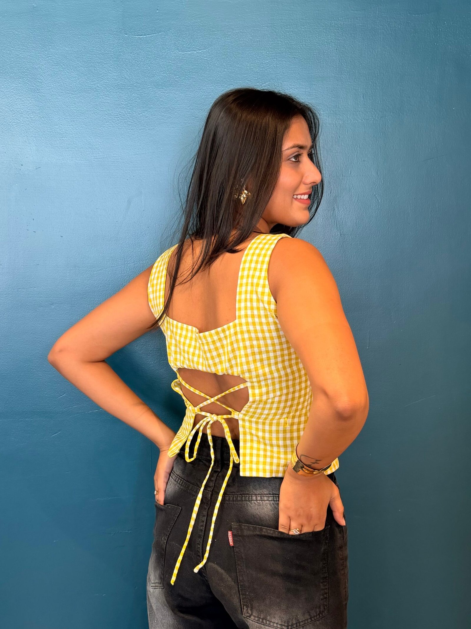 A fresh gingham top with a flattering fit and playful back detail, made for easy summer styling.