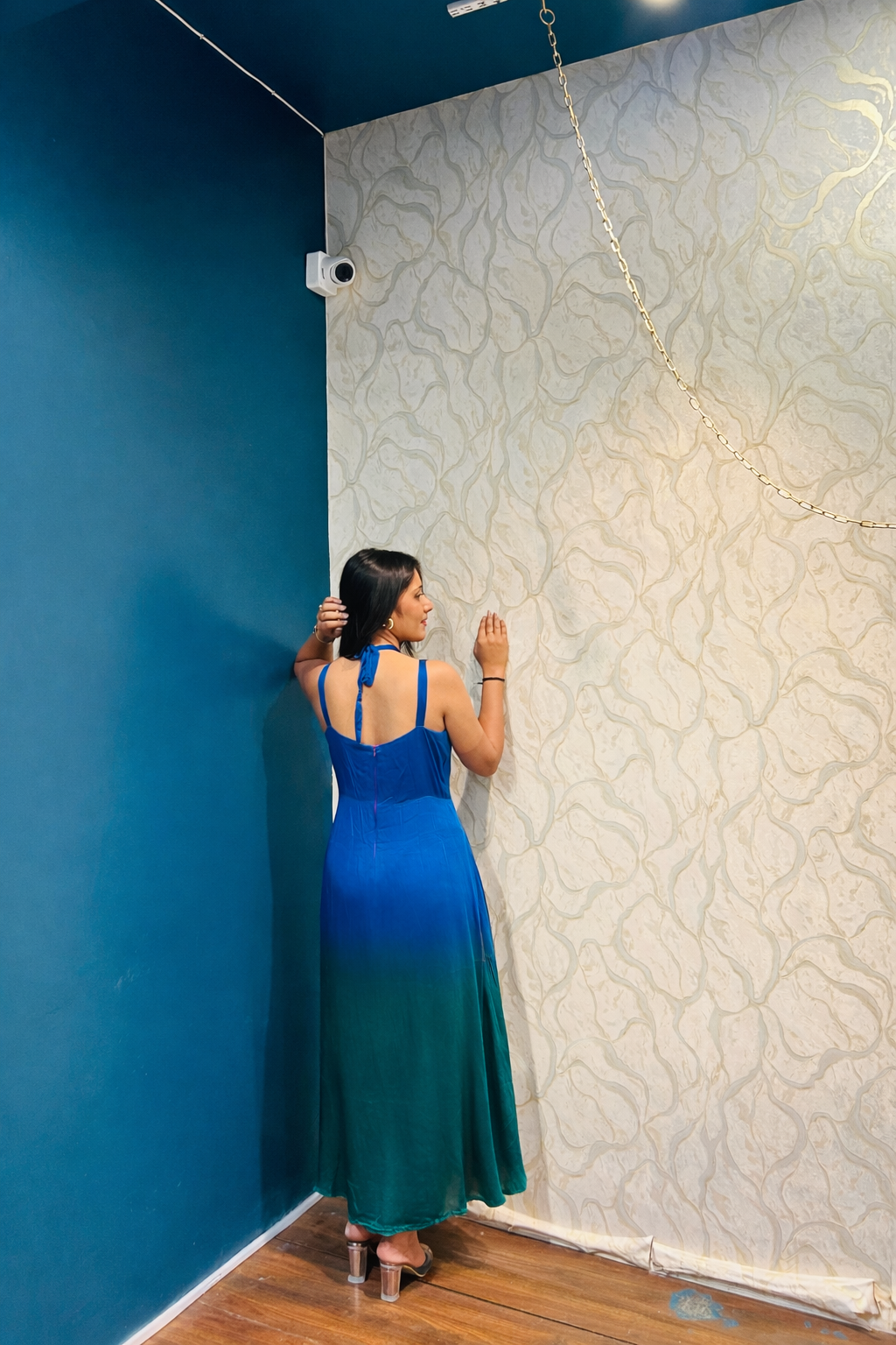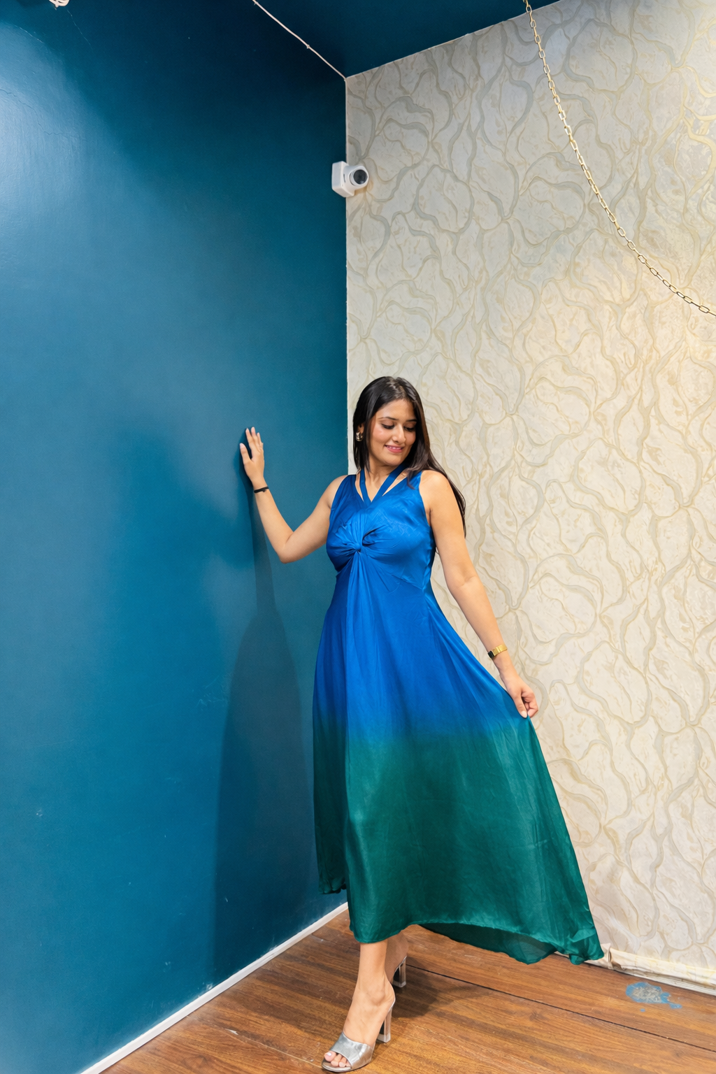 Details: Ombre Dying | Front Deep V neckline | Twisted Knot Detail At Waist | Loose straps To Tie On Neck | Back invisible zip | Lined with soft fabric